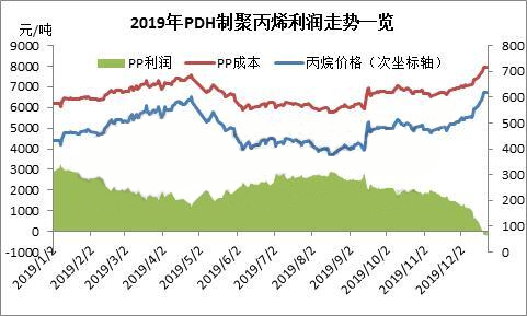 ????????從跟蹤的PDH產(chǎn)業(yè)利潤(rùn)來(lái)看,丙烷脫氫制聚丙烯盈利情況持續(xù)較好,以華東產(chǎn)品為例,2018年理論盈利在2640元/噸,2019年1-11月份盈利在2184元,持續(xù)強(qiáng)于其他工藝盈利水平。然進(jìn)入12月份,國(guó)內(nèi)液化石油氣價(jià)格受國(guó)際市場(chǎng)大漲及國(guó)內(nèi)進(jìn)口資源價(jià)格大幅上行帶動(dòng),各個(gè)地區(qū)出現(xiàn)不同幅度調(diào)漲,丙烷價(jià)格大幅飆升,自11月初至12月底,丙烷國(guó)際價(jià)格漲幅高達(dá)150美元/噸,而反觀國(guó)內(nèi)聚丙烯價(jià)格,自11月初至12月底,卻出現(xiàn)了大幅下滑,一再創(chuàng)下年內(nèi)新低點(diǎn)。丙烷脫氫路線制聚丙烯在中國(guó)聚丙烯市場(chǎng)話語(yǔ)權(quán)方面仍顯薄弱,對(duì)此輪聚丙大跌僅能被動(dòng)接受,導(dǎo)致丙烷-PDH-PP路線利潤(rùn)急速下滑,至12月下旬,已進(jìn)入虧損狀態(tài),考慮當(dāng)前市場(chǎng)售價(jià),丙烷脫氫制聚丙烯單噸虧損已達(dá)200元/噸,且隨著國(guó)際市場(chǎng)丙烷價(jià)格持續(xù)走高,虧損仍有加劇擔(dān)憂。