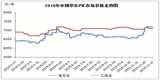 ????????2019年,PVC行情可謂是變化無常,全年呈現(xiàn)旺季不旺、淡季不淡的特點。與往年不同,全年價格最低點出現(xiàn)在3月份,而價格最高點出現(xiàn)在12月。截止12月中旬,PVC市場價格創(chuàng)新高后出現(xiàn)回落,各主銷地區(qū)市場價格陸續(xù)小幅松動,貿(mào)易商出貨多隨行就市為主,個別小幅讓利,下游依舊維持剛需,受利潤空間影響,接貨并不積極。PVC期貨偏弱震蕩以及市場貨源緊缺狀態(tài)有所緩解是目前價格出現(xiàn)松動的主要原因,但前期PVC生產(chǎn)廠家檢修后訂單良好,部分廠家貨源依舊不多仍然限制了PVC價格的回落空間。由上圖可以看出,12月上旬PVC華東市場價格雖出現(xiàn)松動,但空間十分有限。此外,PVC生產(chǎn)企業(yè)檢修已經(jīng)完成,預(yù)計后期供應(yīng)將有一定增加,市場貨源偏緊狀態(tài)將得到改善。