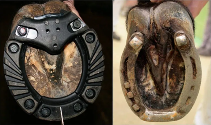 ????????聚氨酯鞋被鋼制鞋釘釘在蹄上,另一面被擰到馬蹄鐵上。