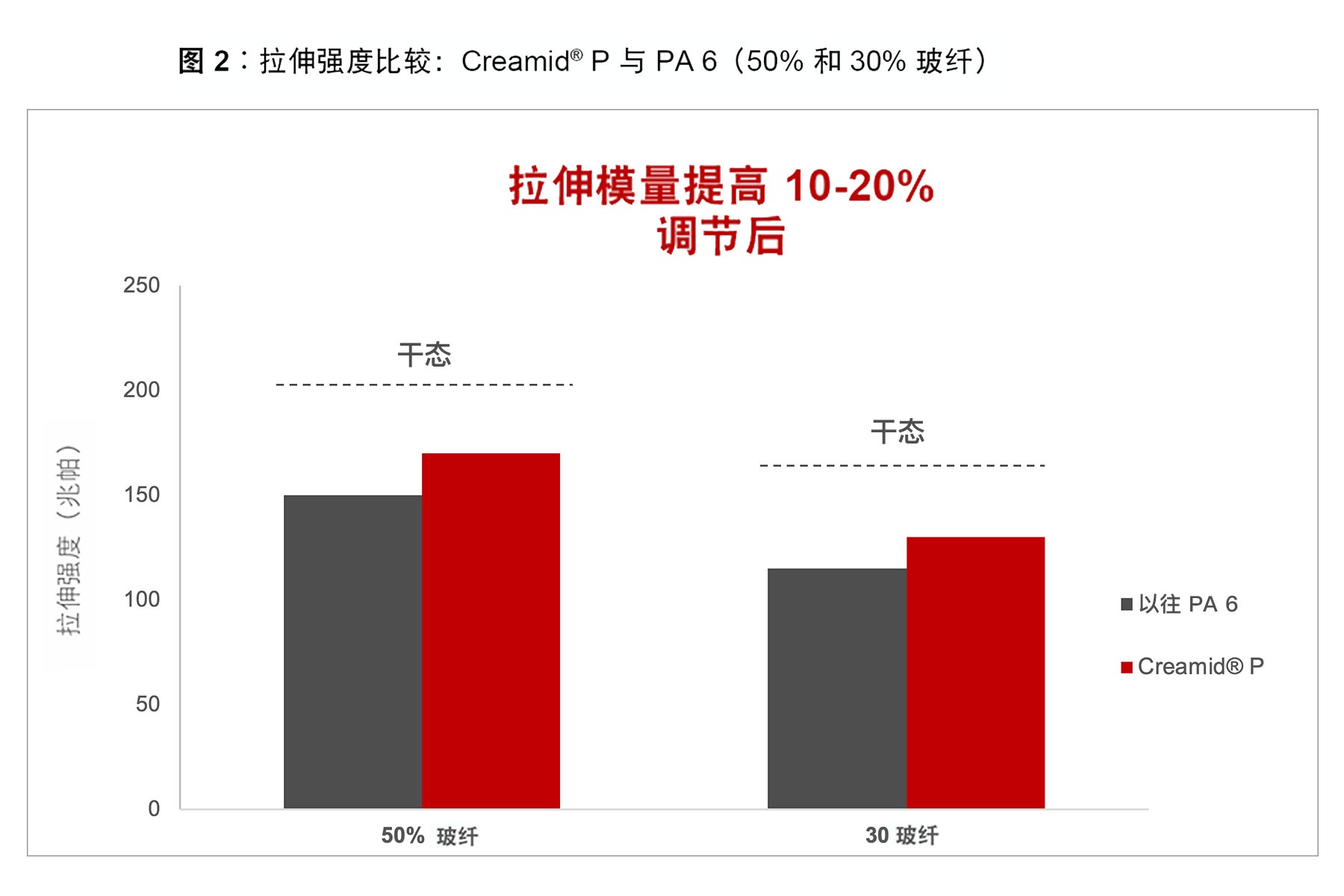 ????????在K 2019展會上,該公司將先行推出兩種Creamid P化合物,其玻纖含量分別為30%和50%。這些化合物經過24小時的濕度調節后,吸水量比典型聚酰胺6少大約80%,飽和吸水量比后者少大約30%。如圖1和圖2所示,濕態的Creamid? P2H7G6 和Creamid P3H2G10比典型PA6表現出更高的拉伸模量和拉伸斷裂強度,。