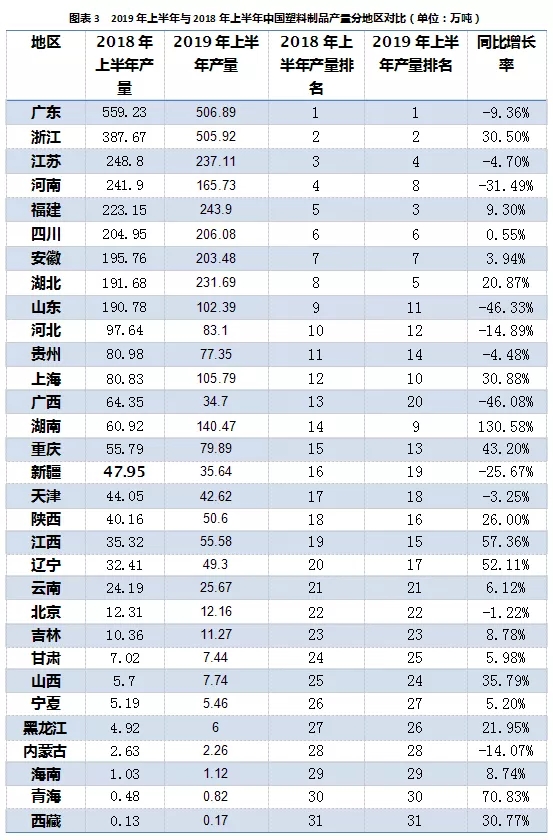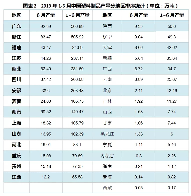 ????????1-6月塑料制品累計(jì)產(chǎn)量排名前五位(廣東、浙江、福建、江蘇和湖北)的總產(chǎn)量達(dá)到1725.51萬噸,占到全國總產(chǎn)量53.3%。(按6月規(guī)模企業(yè)統(tǒng)計(jì))