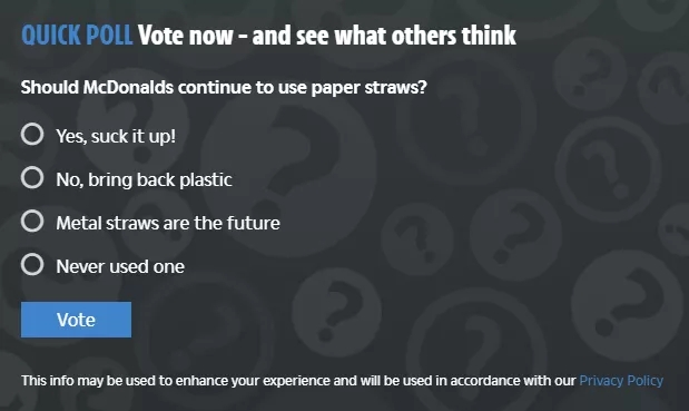 ????????當(dāng)時(shí)麥當(dāng)勞英國(guó)首席執(zhí)行官Paul Pomroy在接受Sky News的采訪時(shí)說(shuō)“現(xiàn)在麥當(dāng)勞使用的塑料吸管其實(shí)是可回收的。但是還是有很多消費(fèi)者向他們表示不滿(mǎn),覺(jué)得用塑料吸管總體來(lái)說(shuō)還是對(duì)環(huán)境不好。”