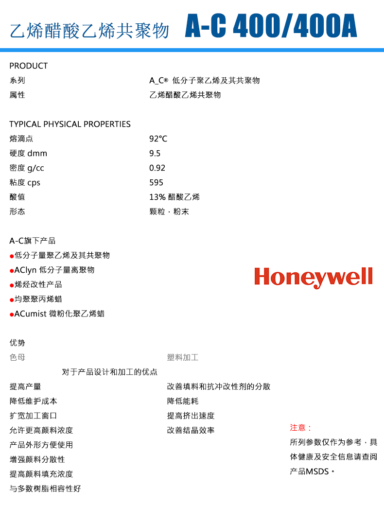 - 霍尼韋爾 honeywell EVA蠟 乙烯-醋酸乙烯共聚物蠟 AC-400A 顏料分散劑 物性表, 霍尼韋爾 honeywell EVA蠟 乙烯-醋酸乙烯共聚物蠟 AC-400A 顏料分散劑 產(chǎn)品參數(shù),霍尼韋爾 honeywell EVA蠟 乙烯-醋酸乙烯共聚物蠟 AC-400A 顏料分散劑 性能表,霍尼韋爾 honeywell EVA蠟 乙烯-醋酸乙烯共聚物蠟 AC-400A 顏料分散劑 出廠報告, MSDS,, 物質(zhì)安全資料表, UL黃卡,{ SGS報告, RoHS, 食品級認證, NSF飲用水標準, 產(chǎn)品資料, 產(chǎn)品性能, 出廠報告, 原廠原包, 代理商, 熱變形溫度, 熔指數(shù), 流動系數(shù), 抗沖擊性能、沖擊強度, 低溫韌性、低溫抗沖擊性能, 熔體流動系數(shù)、熔體流動速率, 加工工藝、加工參數(shù)、加工溫度, 歐盟RoHS 德國FDA 美國FDA 日本FDA