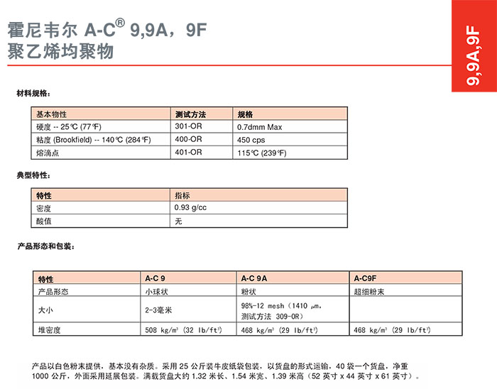 - 霍尼韋爾 AC® 9 低密度聚乙烯 (LDPE) 均聚物 物性表, 霍尼韋爾 AC® 9 低密度聚乙烯 (LDPE) 均聚物 產(chǎn)品參數(shù),霍尼韋爾 AC® 9 低密度聚乙烯 (LDPE) 均聚物 性能表,霍尼韋爾 AC® 9 低密度聚乙烯 (LDPE) 均聚物 出廠報(bào)告, MSDS,, 物質(zhì)安全資料表, UL黃卡,{ SGS報(bào)告, RoHS, 食品級認(rèn)證, NSF飲用水標(biāo)準(zhǔn), 產(chǎn)品資料, 產(chǎn)品性能, 出廠報(bào)告, 原廠原包, 代理商, 熱變形溫度, 熔指數(shù), 流動(dòng)系數(shù), 抗沖擊性能、沖擊強(qiáng)度, 低溫韌性、低溫抗沖擊性能, 熔體流動(dòng)系數(shù)、熔體流動(dòng)速率, 加工工藝、加工參數(shù)、加工溫度, 歐盟RoHS 德國FDA 美國FDA 日本FDA