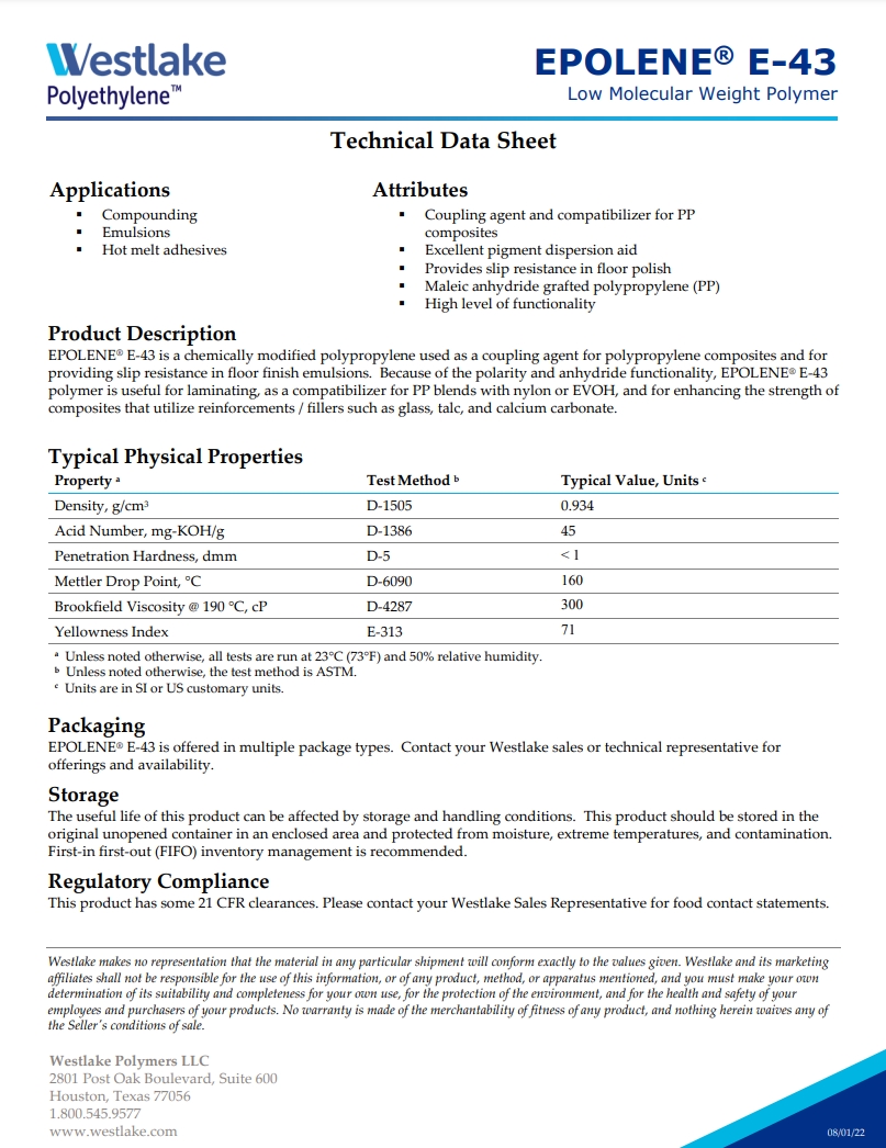 - 西湖化學(xué) E43 Westlake酸酐接枝聚丙烯蠟 EPOLENE E-43 物性表, 西湖化學(xué) E43 Westlake酸酐接枝聚丙烯蠟 EPOLENE E-43 產(chǎn)品參數(shù),西湖化學(xué) E43 Westlake酸酐接枝聚丙烯蠟 EPOLENE E-43 性能表,西湖化學(xué) E43 Westlake酸酐接枝聚丙烯蠟 EPOLENE E-43 出廠報告, MSDS,, 物質(zhì)安全資料表, UL黃卡,{ SGS報告, RoHS, 食品級認(rèn)證, NSF飲用水標(biāo)準(zhǔn), 產(chǎn)品資料, 產(chǎn)品性能, 出廠報告, 原廠原包, 代理商, 熱變形溫度, 熔指數(shù), 流動系數(shù), 抗沖擊性能、沖擊強(qiáng)度, 低溫韌性、低溫抗沖擊性能, 熔體流動系數(shù)、熔體流動速率, 加工工藝、加工參數(shù)、加工溫度, 歐盟RoHS 德國FDA 美國FDA 日本FDA