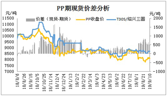 ????????由PP期現貨價差對比發現,期現貨價差在七八月份價差明顯擴大化,進入九月份期貨受資金面及供需面支撐,期貨連漲助推期現貨價差逐步收窄。商家受長期利潤虧損影響,面對期貨連漲局勢,炒作心態油然而生。目前因國內PP產能集中檢修,市場供應面利好支撐市場報盤。期現貨價差受供需影響有進一步收窄趨勢。