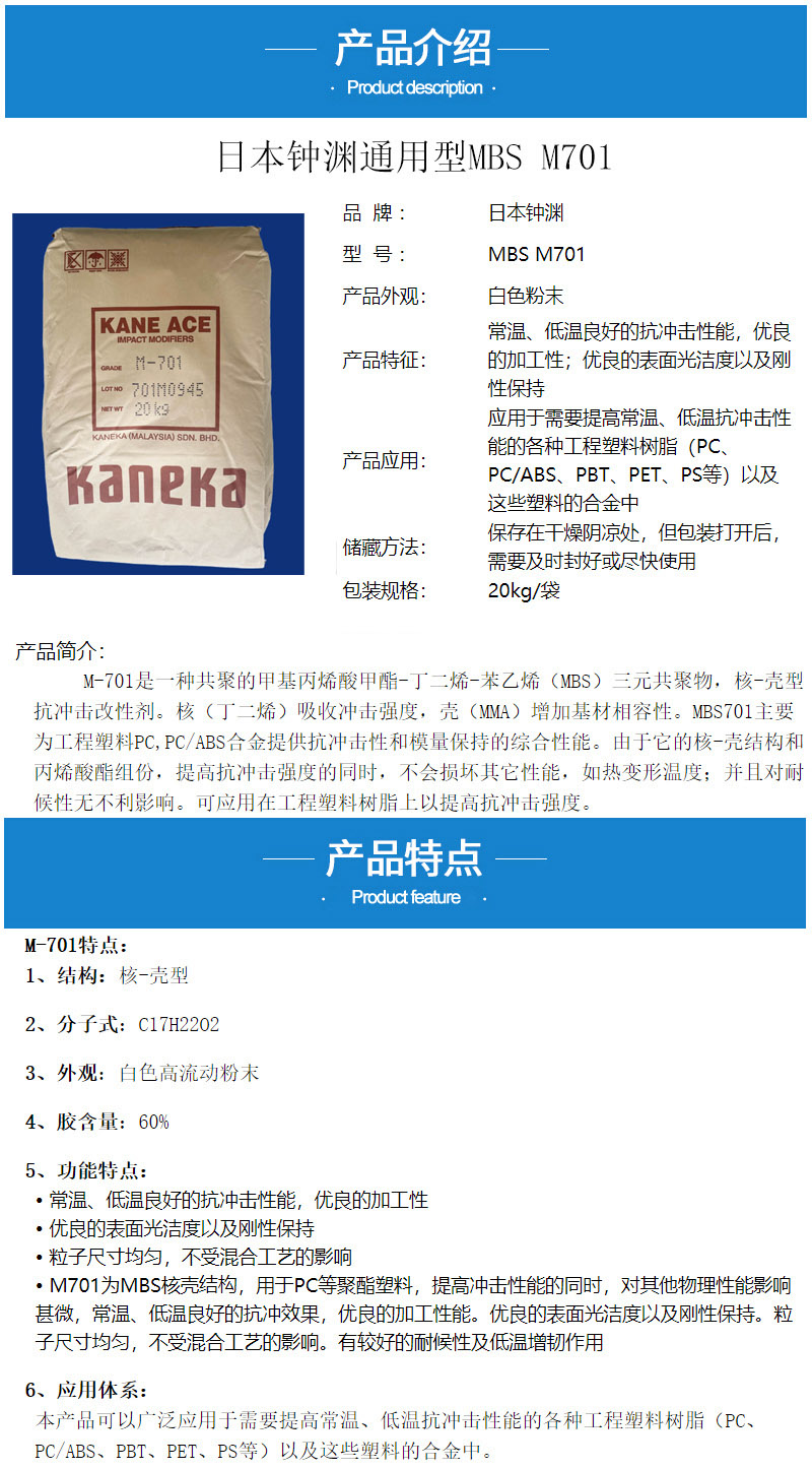• 日本鐘淵MBS M701增韌劑 PC/ABS合金抗沖擊劑 增韌改性鐘淵mbs701 物性表, 日本鐘淵MBS M701增韌劑 PC/ABS合金抗沖擊劑 增韌改性鐘淵mbs701 產品參數,日本鐘淵MBS M701增韌劑 PC/ABS合金抗沖擊劑 增韌改性鐘淵mbs701 性能表,日本鐘淵MBS M701增韌劑 PC/ABS合金抗沖擊劑 增韌改性鐘淵mbs701 出廠報告, MSDS,, 物質安全資料表, UL黃卡,{ SGS報告, RoHS, 食品級認證, NSF飲用水標準, 產品資料, 產品性能, 出廠報告, 原廠原包, 代理商, 熱變形溫度, 熔指數, 流動系數, 抗沖擊性能、沖擊強度, 低溫韌性、低溫抗沖擊性能, 熔體流動系數、熔體流動速率, 加工工藝、加工參數、加工溫度, 歐盟RoHS 德國FDA 美國FDA 日本FDA