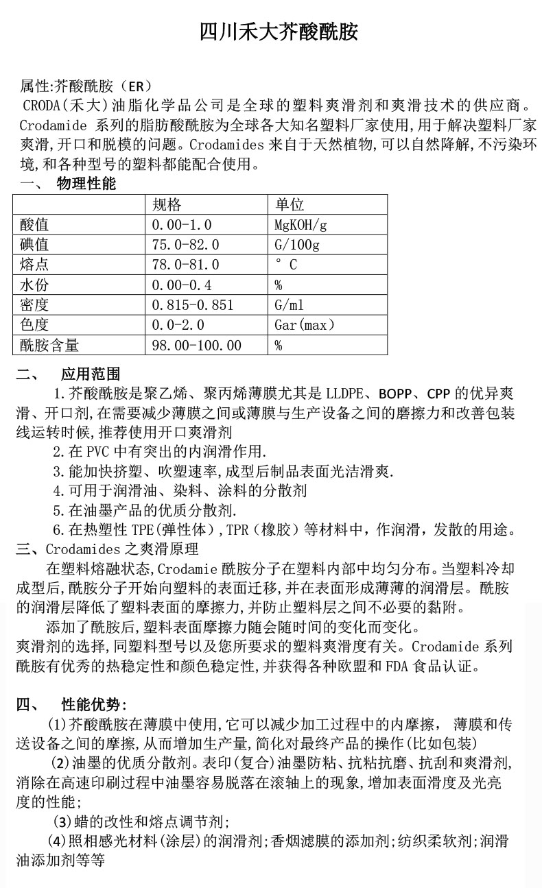- 禾大CRODA芥酸酰胺 ER-CH-BE 物性表, 禾大CRODA芥酸酰胺 ER-CH-BE 產品參數,禾大CRODA芥酸酰胺 ER-CH-BE 性能表,禾大CRODA芥酸酰胺 ER-CH-BE 出廠報告, MSDS,, 物質安全資料表, UL黃卡,{ SGS報告, RoHS, 食品級認證, NSF飲用水標準, 產品資料, 產品性能, 出廠報告, 原廠原包, 代理商, 熱變形溫度, 熔指數, 流動系數, 抗沖擊性能、沖擊強度, 低溫韌性、低溫抗沖擊性能, 熔體流動系數、熔體流動速率, 加工工藝、加工參數、加工溫度, 歐盟RoHS 德國FDA 美國FDA 日本FDA